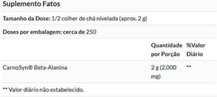 Informações gerais Aditivos ‎Beta Alanina Informações sobre alergia ‎Não contém glúten Unidades ‎1000 unidade Porção recomendada ‎2g (1/4 dosador) Marca