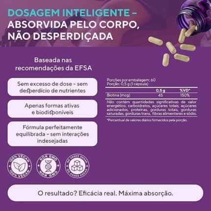 🌟 BIOTINA EM DOSE DEFINIDA – Cada cápsula fornece 45 mcg de biotina. Suplemento vitamínico formulado para complementar a ingestão