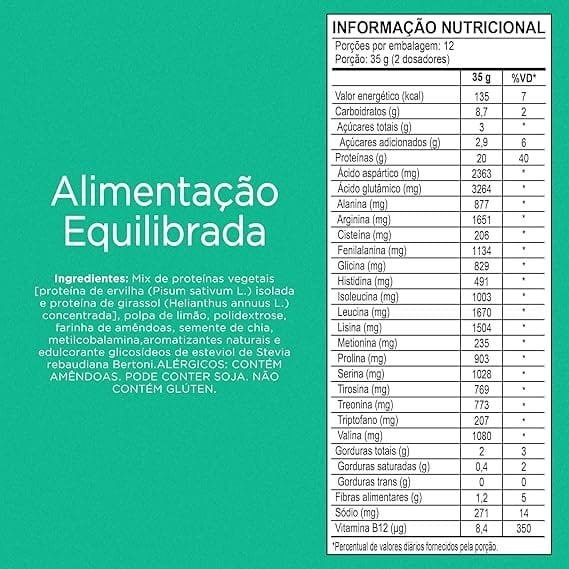 Mix de proteínas vegetais [proteína de ervilha isolada (Pisum sativum L.) e proteína de girassol concentrada (Helianthus annuus L.)], polpa de limão, polidextrose, farinha de amêndoas, semente de chia, metilcobalamina, aromatizantes e edulcorante glicosídeos de esteviol (estévia). ALÉRGICOS: CONTÉM AMÊNDOAS. NÃO CONTÉM GLÚTEN. Contém aromatizante.