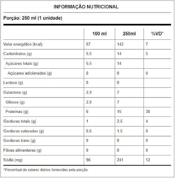Leite semidesnatado, soro de leite reconstituído, xarope de cacau, caseinato de cálcio, concentrado protéico de soro de leite, amido modificado, cloreto de sódio, estabilizantes carboximetilcelulose sódica, fosfato dissódico, fosfato dipotássico, celulose microcristalina e carragena, aromatizante, enzima lactase e edulcorante sucralose.