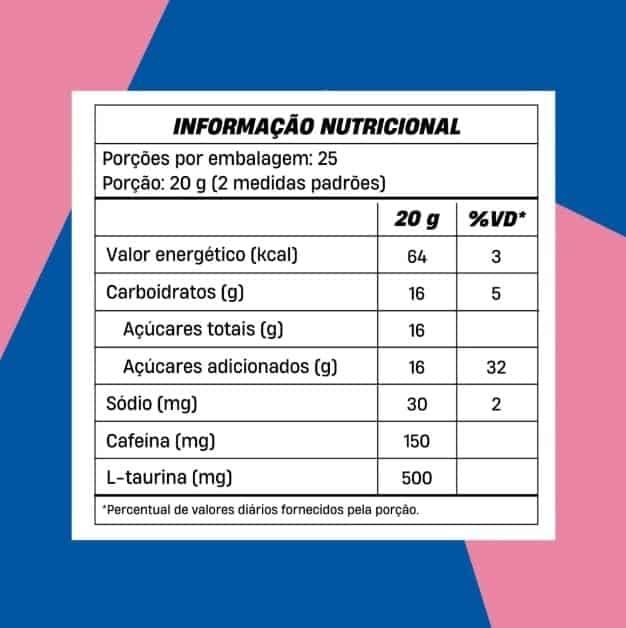 Isomaltulose (PalatinoseTM), L-taurina, cafeína anidra, chá verde em pó, pimenta em pó, gengibre em pó, acidulante ácido cítrico, aroma idêntico ao natural de pink lemonade, corante natural beterraba, antiumectante dióxido de silício, espessante goma xantana e edulcorantes xilitol e stevia.