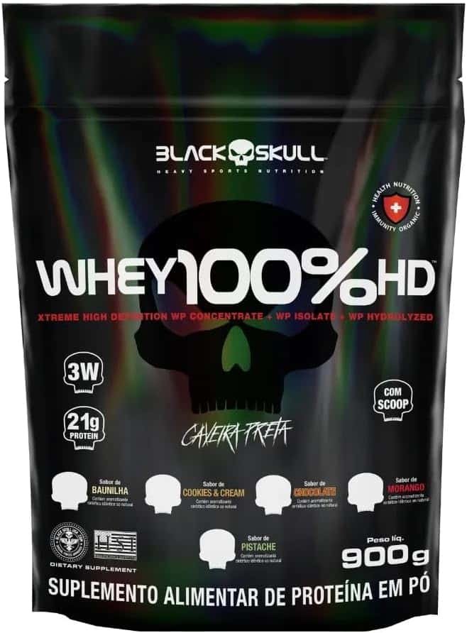 Whey 100% HD é mais um mega suplemento da linha caveira preta! Composto por três tipos de whey protein (concentrado, isolado e hidrolisado), ele é uma ótima opção para auxiliar no ganho de massa muscular! Além disso, sua composição conta também com a adição de BCAA, aminoácidos de cadeia ramificada que contribuem para uma melhor recuperação pós-treino.  INGREDIENTES: Proteína concentrada do soro do leite, proteína isolada do soro de leite, proteína hidrolisada do soro do leite, l-leucina, l-isoleucina, l-valina, aromatizante, espessante goma xantana, corante vermelho beterraba, acidulante ácido cítrico, edulcorantes sucralose e acessulfame de potássio. CONTÉM LACTOSE. NÃO CONTÉM GLÚTEN. COMO CONSUMIR WHEY 100% HD? Misture 3 colheres de sopa (aprox. 30g) de Whey 100% HD em 150 ml de água, ou de acordo com a consistência desejada, e consuma uma vez ao dia ou de acordo com a orientação de um profissional especializado. Recomendação para adultos acima de 19 anos de idade. WHEY PROTEIN Um dos suplementos mais consumidos do mundo atualmente por diversas áreas no esporte como também na nutrição clínica, derivado do soro do leite, mais conhecido como Whey Protein, garante proteína de alto valor biológico com objetivos de manutenção muscular, auxiliar no anabolismo e recuperação das fibras musculares de praticantes de atividades físicas em geral até em pacientes que necessitam de uma dieta enteral. As proteínas obtidas a partir do soro do leite são classificados conforme o seu grau de processamento, como: proteínas concentradas, isoladas e hidrolisadas. SRO – um processo de refinação que remove os contaminantes usando pressão da água para forçar as moléculas através de uma membrana semipermeável. Durante esse processo, os contaminantes são filtrados e lavados, deixando a proteína mais pura.