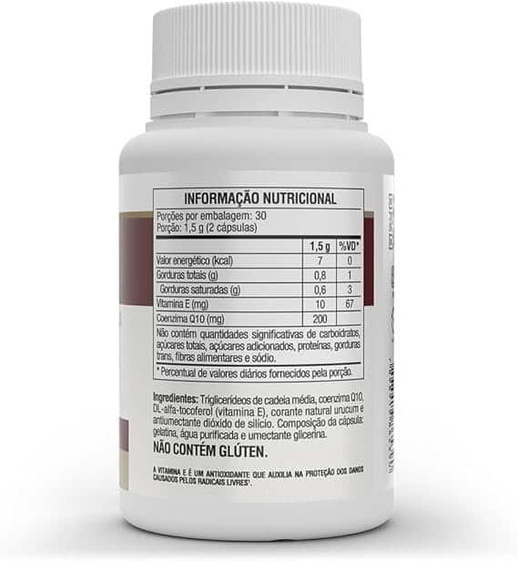 Ingredientes ‎Triglicerídeos de cadeia média, coenzima Q10, DL-alfatocoferol (vitamina E), corante natural de urucum e antiumectante dióxido de silício. Composição da cápsula: gelatina, água purificada e umectante glicerina. NÃO CONTÉM GLÚTEN.